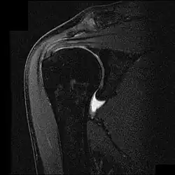![]() Imagen por resonancia magnética nuclear mostrando el pinzamiento y ruptura parcial del tendón del músculo supraespinoso. | ||