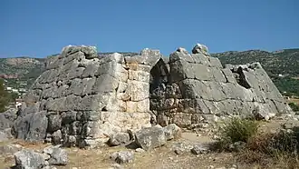 - La datación de algunas partes de los grandes bloques megalíticos superpuestos en la pared, con el novedoso método de datación por termoluminiscencia de las superficies rocosas. El muestreo fue elegido por su firmeza y la falta de exposición al sol de las superficies de contacto interno, mediante la eliminación de unos pocos gramos de polvo de las piezas en contacto firme. Siete piezas dieron un rango de edad de entre 2000-2500 aC,[12][13][14] mientras que dos tiestos cerámicos de tipología no diagnosticada, uno de Elliniko y otro de Ligurio, fechados por los métodos de «TL» y «OSL» dieron edades concordantes de 3000 ± 250 a. C. y 660 ± 200 a. C. respectivamente.[15] Este marco temporal colocaría la construcción de estas estructuras superpuestas a la construcción de las pirámides en Egipto.