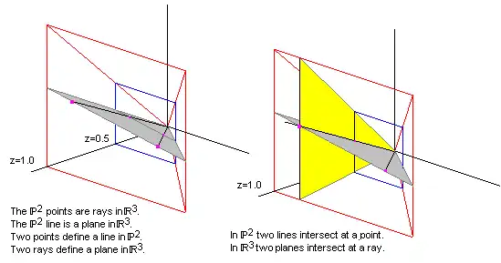 El punto homogéneo (0, 0, 0) es donde van todos los puntos reales cuando se mira el plano desde una distancia infinita, una línea en el plano z = 0 es donde se cruzan las líneas paralelas.
