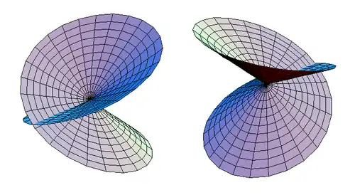 El plano z = 0 corta el disco auto intersecante en un par de discos que son reflejos especulares entre sí. Los discos tienen centros en el origen.
