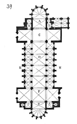 - ningún coro tiene deambulatorio y ambos están rodeado por dos torres-campanarios (B e I), cuya planta baja se abre al coro y el transepto en capillas;