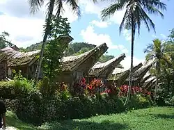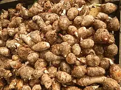 Los ñames (Dioscorea spp.) son un grupo muy grande de plantas nativas de todas las regiones tropicales y templadas cálidas del mundo. Varias especies de ñames fueron domesticadas y cultivadas de forma independiente dentro de la isla del sudeste asiático y Nueva Guinea, debido a sus tubérculos almidonados. Este grupo incluye al ube o ñame acuático (Dioscorea alata), al ñame volador o papa voladora (Dioscorea bulbifera), al ñame indio de tres hojas (Dioscorea hispida), el ñame menor (Dioscorea esculenta), el ñame del Pacífico o ñame común (Dioscorea nummularia), el ñame de cinco hojas (Dioscorea pentaphylla) y el ñame lápiz (Dioscorea transversa).[144] Entre estos, D. alata y D. esculenta fueron las únicas especies cultivadas y comidas regularmente, mientras que el resto generalmente se consideraban como alimentos de hambruna, debido a sus niveles más altos de la toxina dioscorina, lo que requería que se prepararan correctamente antes del consumo.[145]