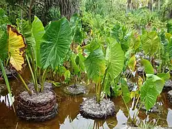 El taro (Colocasia esculenta), a veces llamado "taro verdadero", es uno de los cultivos más antiguos previo a la expansión austronesia.[6] El taro se encuentra ampliamente distribuido en las regiones tropicales y subtropicales del sur de Asia, el este de Asia, el sudeste de Asia, Papúa Nueva Guinea y el norte de Australia; siendo una especie altamente polimórfica, lo que dificulta su taxonomía y su distinción entre los tipos silvestres y cultivados. Se cree que fueron domesticados de forma independiente en múltiples ocasiones, y diversos autores dieron como posibles ubicaciones de domesticación a Nueva Guinea, el sudeste de Asia continental y el noreste de India, basándose en gran medida en el rango nativo asumido de las plantas silvestres.[69][70][71] Sin embargo, los estudios más recientes han señalado que el taro silvestre puede tener una distribución nativa mucho más grande de lo que se creía anteriormente, y pueden ser que algunas especies silvestres puedan ser indígenas de otras partes de la isla del sudeste asiático.[72][73]