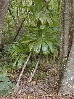 Esta planta fue transportada a través de Oceanía por los austronesios, llegando hasta Hawái, Aotearoa (Nueva Zelanda), Rangitāhua (Islas Kermadec) y Rapa Nui en su mayor extensión. Un tipo de planta de ti particularmente importante en la Polinesia, es un gran cultivar de hoja verde que se cultiva por sus rizomas comestibles agrandados. A diferencia de las poblaciones de planta de ti en el sudeste asiático y Oceanía Cercana, este cultivar es casi completamente estéril en las islas del este de la Polinesia. Solo se puede propagar mediante esquejes de los tallos o los rizomas. Se especula que esto fue el resultado de una selección artificial deliberada, probablemente para producir rizomas más grandes y menos fibrosas que se adecuaran más para su uso como alimento.[91][93][94]