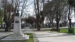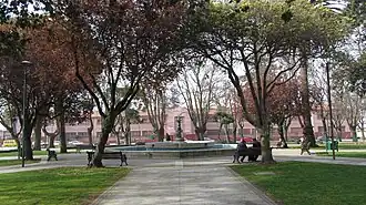 La plaza en 2012, con sus árboles característicos y su pileta. Al fondo, el colegio de niñas María Inmaculada | ||