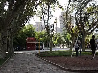 Posee una fuente de agua y en el centro el monumento a Narciso Laprida, de quien se le debe su nombre y una importante cantidad de especies árboreas de Platanus hispanica o plátanos.