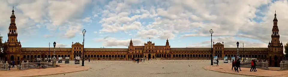 La plaza de España es un conjunto arquitectónico enclavado en el parque de María Luisa de la ciudad de Sevilla (Andalucía, España). Fue proyectada por el arquitecto Aníbal González. Se levantó entre 1914 y 1929 y es la construcción más grande de la Exposición Iberoamericana de 1929.[2][nota 1]