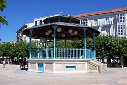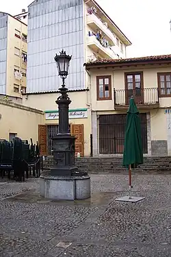 Después fue apareciendo el mobiliario urbano: una farola de varios focos asentada sobre una base circular que formaba una rosa de los vientos a la que el pueblo bautizó como la Estrella. Más tarde se plantaron árboles y se pusieron más farolas de hierro colado, bancos para sentarse[nota 1] y un kiosco o templete para la música.[1]