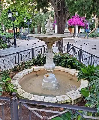 En la plaza también se sitúa una fuente de mármol blanco adornada con peces y caras de león y el mosaico que señala el punto n.º 4 de la Ruta de Fermín Salvochea.