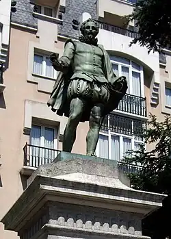 ... para el forastero no tiene esa plaza más mérito que un monumento: la estatua de un hombre en uniforme militar, a la usanza española antigua, con gola y estoque. ... la estatua que ante nosotros tenemos caminó en carne y hueso un día por la tierra, fue un rey del ingenio cuyas obras iluminaron todo el orbe culto; su memoria es una bendición. Con toda la facultad de su fuerza viril arrastró cadenas de esclavo; por su patria, por España, sacrificó en la lucha su brazo izquierdo; y sus contemporáneos le dejaron pasar hambre y miseria, le trataron con indiferencia, no supieron reconocer y apreciar su valía.[3]