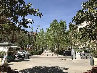 ![]() Zona sur de la plaza, con sus jardines, fuente central y zona lúdica | ||