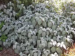 Alcanza un tamaño de 1 m de alto y ancho, es un arbusto de difusión de hoja caduca. Las hojas son peludas ovadas a ovadas amplias, de 5-11,5 cm de largo, y 3-5,5 cm de ancho con crenados márgenes. Los pelos dan a la planta de un color general verde a color plateado. Las flores nacen en terminales en forma de racimos de hasta 30 cm de largo y son de color blanco azulado.[1] [2]