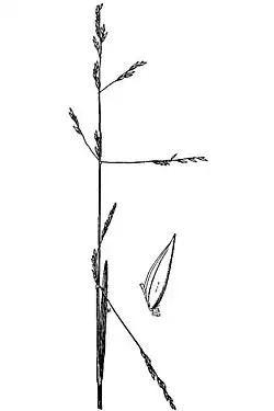 Es una hierba anual que crece en grupos, alcanzando un tamaño de hasta 60 centímetros de altura. La inflorescencia ocupa los primeros 10 a 15 centímetros del tallo. Es estrecha en flor, aplanada, con un crecimiento paralelo al tallo. A medida que el fruto se desarrolla las ramas van hacia fuera, convirtiéndose en perpendicular al tallo, caídas. Las ramas tienen pocas espiguillas y espaciadas.