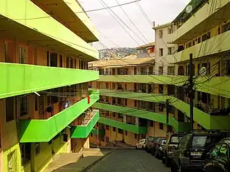 El conjunto habitacional está compuesto de cinco edificios en bloque de cuatro a cinco pisos de estilo moderno, que siguen la topografía de la quebrada y que presentan un uso casi exclusivamente residencial.[1] Cuenta con pasarelas y balcones para la accesibilidad a las viviendas, creando fachadas continuas escalonadas según la pendiente de la quebrada.[1] Estas circulaciones horizontales nacen a nivel de la calle y terminan a cinco metros de altura, generando miradores.[4]
