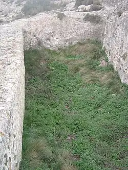 En los laterales se aprecian unas hendiduras en la piedra que presumiblemente servirían para introducir trancas de madera y sujetar así las ruedas evitando el deslizamiento por la pendiente. En la meseta se pueden observar habitaciones excavadas en la roca, escaleras, y numerosos depósitos (más de 100), el mayor llamado "El Trinquete" de 29 x 5 m, con una profundidad estimada de 14 m (más de 2000 m³). No todos los depósitos serían aljibes, ya que algunos pudieron ser utilizados como graneros o almacenes.