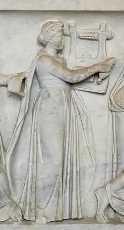 La poesía lírica la desarrolló el músico y poeta Terpandro en la isla de Lesbos. Para los antiguos griegos, la poesía lírica tenía un preciso significado técnico: verso que es acompañado por la lira u otro instrumento de cuerda (como el barbitón). El poeta lírico fue diferenciado del escritor de las obras (aunque el drama ateniense incluía odas corales, en forma lírica), como el autor de versos trocaicos o yámbicos (los cuales eran recitados), o el escritor de elegías (acompañadas por una flauta más que por la lira) y el de épica.[6] Los alumnos helenísticos de Alejandría instauraron un canon de nueve poetas líricos considerados de especial importancia. Algunos de estos poetas-músicos arcaicos y clásicos son Safo de Mitilene, Alceo de Mitilene, Anacreonte y Píndaro. La lírica arcaica se caracterizaba por una composición estrófica y por una ejecución musical. Algunos poetas como Píndaro extendieron las formas métricas a una tríada que constaba de una estrofa, una antistrofa (métricamente igual a la estrofa) y un epodo (el cual no coincide con la estrofa).[7][8][9]