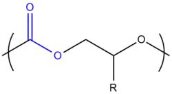 Uno de los grupos más importantes y estudiados de los polímeros biodegradables son los poliésteres. Los poliésteres se pueden sintetizar de varias maneras, incluyendo la condensación directa de alcoholes y ácidos, la polimerización por apertura de anillo (ROP), y las reacciones de polimerización catalizada por metales.[10] Una gran desventaja de la polimerización escalonada por condensación de un ácido y un alcohol es la necesidad de eliminar continuamente el agua de este sistema con el fin de promover el equilibrio de la reacción.[11] Esto puede requerir condiciones adversas y tiempos largos de reacción, dando como resultado una amplia dispersidad. Se puede utilizar una gran variedad de materiales iniciadores para sintetizar los poliésteres, y cada tipo de monómero dota a la cadena polimérica final con diferentes características y propiedades. La ROP del ácido glicólico o láctico dimérico cíclicos forma α-hidroxiácidos que luego se polimerizan en poli-(α-ésteres). Se pueden usar diferentes iniciadores organometálicos para empezar la polimerización de poliésteres, como los complejos de estaño, zinc y aluminio. El más común es el octanato de estaño (II) y que ha sido aprobado como aditivo alimentario por la FDA de los EE. UU., pero aún existen preocupaciones sobre el uso de los catalizadores de estaño en la síntesis de polímeros biodegradables para usos biomédicos. La síntesis de poli(β-ésteres) y poli(γ-ésteres) se puede llevar a cabo por ROP similar o por métodos de condensación como con los poli-(γ-ésteres). También se está explorando el desarrollo de un proceso libre de metales que implica el uso de catálisis bacteriana o enzimática en la formación de poliésteres.[12][13] Estas reacciones tienen el beneficio de ser generalmente regioselectivas y estereoespecíficas pero padecen del alto coste de las bacterias y enzimas, de tiempos de reacción largos y productos de bajo peso molecular.