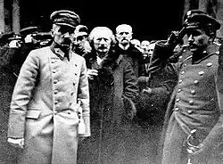 Tras el final de la guerra, Piłsudski fue jefe de Estado entre 1918 y 1922.[4] Interesado principalmente en cuestiones militares, en las que desaprobaba cualquier interferencia,[5] no permitió hasta diciembre de 1919 el nombramiento de ministros de Defensa, quedando el Ejército bajo su control directo.[6] Durante la guerra polaco-soviética, dirigió personalmente los ejércitos polacos contra la URSS.[6] Hasta formación del primer gabinete de la derecha en mayo de 1923, todos los ministros de Defensa fueron partidarios del mariscal.[7]
