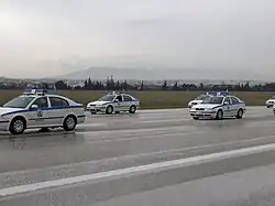 Los vehículos más comunes de la Policía Griega son los Citroën Xsara, Škoda Octavia, Mistubishi Lancer Evolution X, Hyundai i30 y el Citroën C4. Años anteriores fueron utilizados los siguientes modelos: