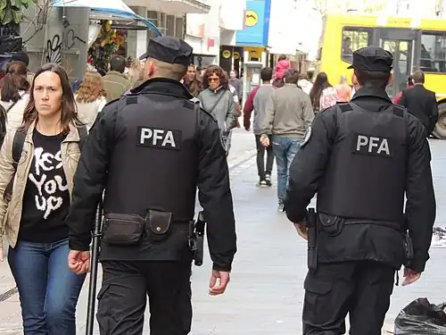 - Policía Federal Argentina (PFA): es una institución armada que depende del Poder Ejecutivo Nacional a través del Ministerio de Seguridad. Cumple funciones en delitos Federales en todo el territorio del Gobierno de la Nación. Cuenta con destacamentos en todas las jurisdicciones de primer orden del país (23 provincias y la Ciudad Autónoma de Buenos Aires). En el pasado, hasta el último día de 2016, la Policía Federal tuvo el poder de policía local en la Ciudad Autónoma de Buenos Aires, pero debido a la creación de la Policía de la Ciudad que entró a funcionar el 1 de enero de 2017, ahora la Federal solo se dedica exclusivamente a los crímenes y asuntos federales a lo largo y ancho del país. Se encarga de investigar temas con respecto al crimen organizado, contrabando de drogas, lavado de dinero, contrabando de personas, engaños electrónicos y terrorismo. Cuenta también con una división de operaciones especiales, el Grupo Especial de Operaciones Federales (GEOF), encargado de llevar a cabo misiones antiterroristas y de antinarcóticos, así como del rescate de rehenes y de brindar protección a jefes de Estado que visiten el país. Cuenta con la Aviación Federal, que incluyen aviones y helicópteros para el uso policial. Aparte del GEOF, está el GE-1 (Grupo Especial 1) que es el grupo de la CGI especializada en acciones altas, medianas y bajas intensidades. La policía cuenta con un gran número de patrulleros, camionetas, motos, blindados, combis, cuatriciclos, camiones hidrantes, camionetas de asalto, etc. La PFA cuenta con su propia unidad de bomberos y equipo de rescate. Su uniforme, de color azul marino, se asemeja mucho a de la policía de Nueva York de EE. UU., con excepción de la banda azul alrededor del gorro. Es miembro de la Interpol desde el año 1962 y era la encargada de la emisión de pasaportes y cédulas de identidad hasta el año 2010 en el cual la cédula fue reemplazada por el nuevo DNI en formato tarjeta expedido por el Registro Nacional de las Personas, dependiente del Ministerio del Interior. El Comisario General de la PFA, Néstor Valleca, es el jefe de la sección América de la INTERPOL.