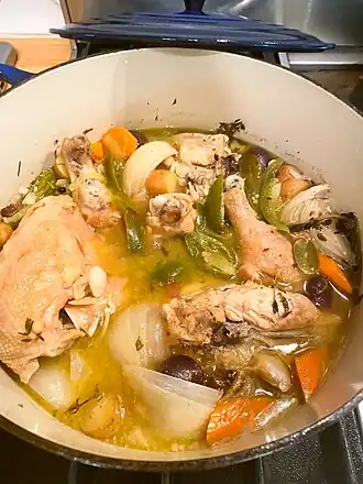 | Ingredientes | pollo · ajo · chile xalapeño o largo · cebolla · pasas · almendras · tomillo · laurel · clavo de olor · aceite de oliva · vino blanco seco · zanahorias · papas · vinagre de manzana · sal · pimienta | |