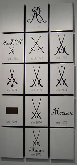 Con el fin de identificar los productos originales de Meissen, se marcaban al principio con un diseño pintado en la superficie. Enseguida, estos diseños identificativos se grabaron en azul por debajo del vidriado. Las primeras marcas como "AR" (Augustus Rex, el monograma del rey), K.P.M. (Königliche Porzellan-Manufaktur), M.P.M. (Meissener Porzellan-Manufaktur) y K.P.F. ("Königliche Porzellan-Fabrik) fueron sustituidas finalmente por el logotipo de las dos espadas cruzadas. Introducido en 1720, se empezó a utilizar de forma habitual a partir de 1731 por decreto oficial. Las diferentes variaciones en el estilo de las espadas permiten hoy en día datar las porcelanas de Meissen.