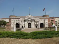 La planta, rectangular, se articula como un sistema de tres carriles particularmente elaborado, caracterizado por cuatro grandes pilares con pilastras dóricas que los separan y a los que correspondían las pilastras de los muros laterales; desde los carriles laterales se accedía a los puestos de guardia, con chimeneas, y a pequeñas habitaciones que podían utilizarse como celdas. Los interiores están casi totalmente cubiertos de rusticación. Se podía acceder a la puerta desde el campo gracias a unos puentes levadizos de madera que descendían hasta el puente fijo de mampostería, que cruzaba el profundo foso con maestría.