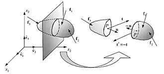Consideremos un medio continuo sobre el que actúan las correspondientes fuerzas másicas y superficiales. Consideremos también una partícula P del interior del medio continuo y una superficie arbitraria, que pasa por el punto P y de normal unitaria n en dicho punto, que divide al medio continuo en dos partes (volúmenes materiales). En la superficie de corte, considerada ahora como parte del contorno de cada uno de estos volúmenes materiales, actuarán las fuerzas superficiales debidas al contacto entre ambos.