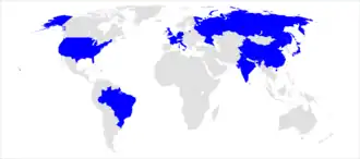 ![]() Países con armas nucleares del NPT —los miembros permanentes del Consejo de Seguridad de las Naciones Unidas— (China, los Estados Unidos, Francia, el Reino Unido y Rusia) Otros países con armas nucleares (la India, Pakistán y Corea del Norte) Otros países que se cree que tienen armas nucleares (Israel) Países en la Compartición nuclear de la OTAN (Alemania, Bélgica, Italia, los Países Bajos y Turquía) Países que alguna vez tuvieron armas nucleares (Bielorrusia, Ucrania, Kazajistán y Sudáfrica) |