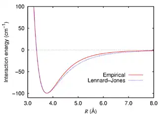 i.e., en , el potencial LJ es aproximadamente 1/60 de su valor mínimo (profundidad del potencial).