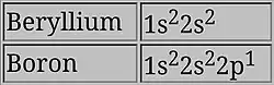 El boro tiene su último electrón en un orbital 2p, que tiene su densidad electrónica más lejos del núcleo en promedio que los electrones 2s en la misma capa. Los electrones 2s entonces protegen al electrón 2p del núcleo hasta cierto punto, y es más fácil quitar el electrón 2p del boro que quitar un electrón 2s del berilio, lo que resulta en una energía de ionización más baja para el B.