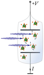 La energía de ionización de los átomos, denominada Ei, se mide[4] hallando la energía mínima de los cuantos de luz (fotóns) o electrones acelerados a una energía conocida que expulsarán a los electrones atómicos menos ligados. La medición se realiza en fase gaseosa en átomos individuales. Aunque sólo los gases nobles se presentan como gas monoatómico, otros gases pueden dividirse en átomos individuales.[5] Asimismo, muchos elementos sólidos pueden calentarse y vaporizarse en átomos individuales. El vapor monoatómico está contenido en un tubo previamente evacuado que tiene dos electrodos paralelos conectados a una fuente de tensión. La excitación ionizante se introduce a través de las paredes del tubo o se produce en su interior.