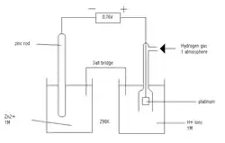 donde es el potencial estándar del ánodo (el signo del valor del potencial de reducción estándar para ese electrodo se ha invertido y por ello lleva un signo menos delante) y es el potencial estándar del cátodo, tal como figura en el cuadro o tabla de potenciales de electrodo estándar.