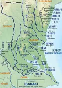 - Río Kinu (鬼怒川), con un recorrido en Ibaraki de 62,84 km de un total de 174,5 km, desemboca en el río Tone. Antes del período Edo, el río Keno (毛野川 - hoy Kino), era el río principal del sistema del río Keno, que vertía sus aguas junto con el desaparecido río Hitachi (常陸川) en un gran lago interior desaparecido, llamado Mar Katori (香取海 katori-umi), que incluía los actuales lagos del Kasumigaura y las lagunas Tega (手賀沼) e Inba (印旛沼) de la Prefectura de Chiba conectados con el Océano Pacífico. Este río, llamado Keno en ese entonces, dividía de norte a sur al país o provincia de Keno (毛野国), una antigua zona de Japón, que incluía las actuales prefecturas de Gunma y Tochigi. Durante el período Edo se trabajó en el desarrollo de la cuenca del río Tone para evitar inundaciones y permitir el transporte de pasajeros y mercancías por río y se comienza la separación del río de Kokai y del río Keno (hoy Kinu) para conectarlos con el río Tone.