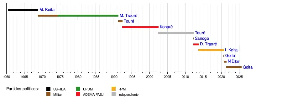 El primer presidente fue Modibo Keïta que asumió los poderes de jefe de Estado y de Gobierno, estableció el unipartidismo (sólo era legal la Unión Sudanesa-Movimiento Democrático Africano) y persiguió a la oposición. En 1967 suspendió la constitución y creó Comité Nacional de Defensa de la Revolución. Sin embargo el 19 de noviembre de 1968 el lugarteniente Moussa Traoré organizó un golpe de Estado y derrocó a Keïta, a quien envió a la prisión de Kidal, en el norte del país. Traoré ejerció la jefatura de estado de su país entre 1968 y 1991, instaurando un represivo régimen militar, que posteriormente devino en una dictadura de partido único, que duró más de dos décadas. Poco después de tomar el poder, todas las actividades políticas fueron prohibidas. Se instaura un régimen militar bajo la dirección del capitán Tiécoro Bagayolo.