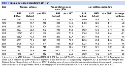 La base de datos de gastos militares de SIPRI 2017 estimó el gasto militar de Rusia en 2016 en 69.200 millones de dólares estadounidenses.[27] Esta estimación es aproximadamente el doble de la estimación del SIPRI del presupuesto militar ruso para 2006 (34.500 millones de dólares estadounidenses).