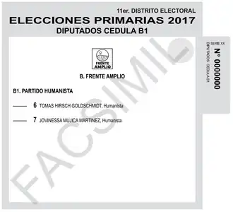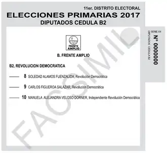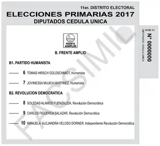 En todos los distritos, excepto el número 11, existió una sola cédula de votación puesto que un solo partido de los integrantes del Frente Amplio inscribió candidaturas en cada sector. En el caso del distrito 11 se vivió una situación particular, en la cual se presentaron 3 tipos de cédula: una con todos los candidatos, tanto del Partido Humanista (PH) como de Revolución Democrática (RD); otra exclusiva para los militantes del PH, quienes podían votar solamente por los candidatos de su partido; y otra con la misma situación pero para los militantes de RD.