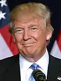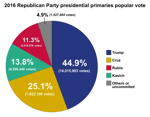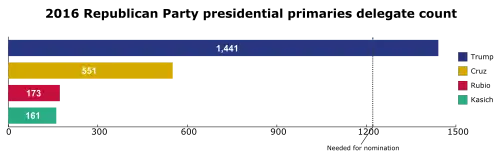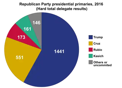 A mediados de mayo Trump obtuvo suficientes delegados para ser seleccionado como candidato.[38] Lo que causó la salida de los últimos dos candidatos restantes Kasich y Cruz (en junio).[39][40][41] El presidente del Comité Nacional Republicano Reince Priebus declaró a Trump presunto candidato mediante su cuenta de Twitter. Trump no obtuvo originalmente el apoyo de destacados líderes republicanos como Nick Ryan, Mitt Romney, Lindsay Graham o la familia Bush,[42] aunque Ryan lo apoyaría luego.[43]