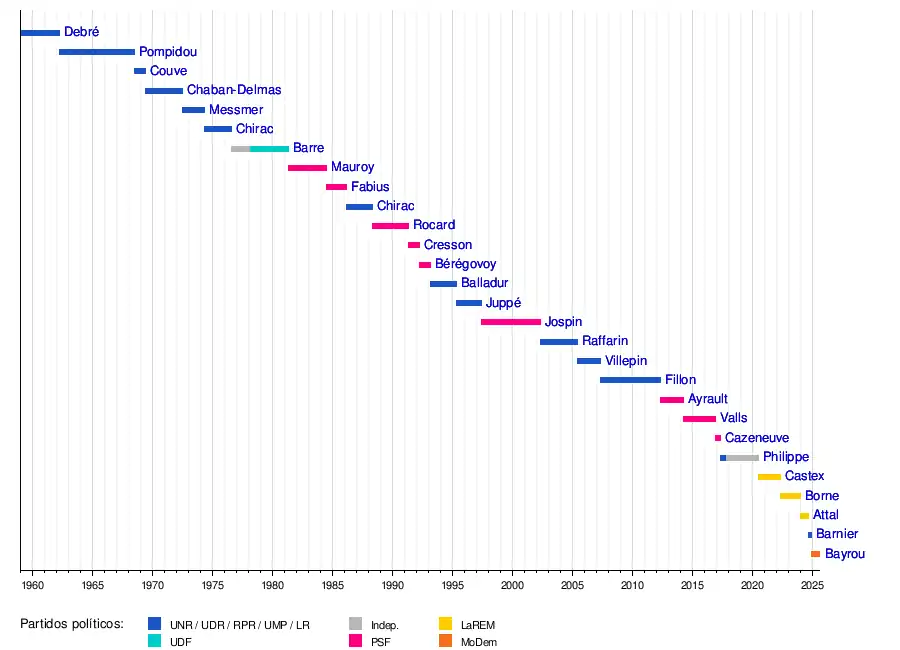 Michel Debré | • | 8 de enero de 1959 | 14 de abril de 1962 | Unión para la Nueva República | I (1958) | Charles de Gaulle![]() (1959-1969) | ||