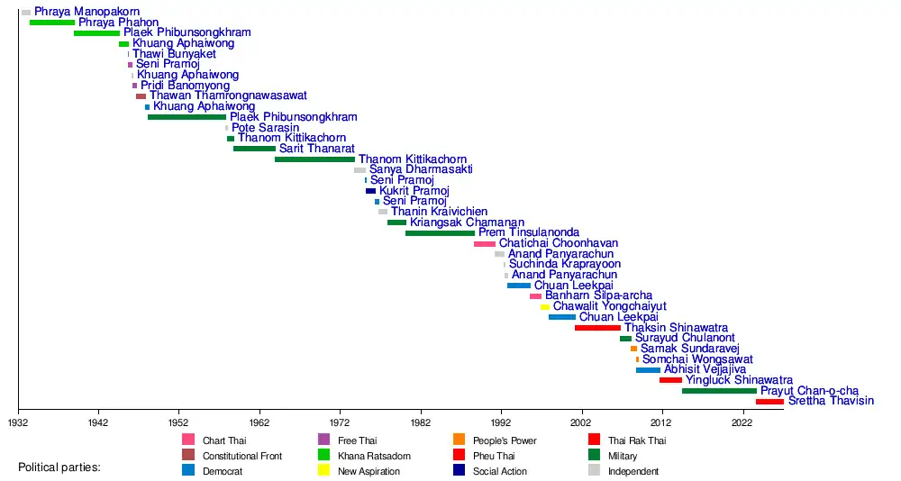 El primer primer ministro de Siam fue Phraya Manopakorn Nititada, un juez. El título de la oficina se cambió de "Primer Ministro de Siam" a "Primer Ministro de Tailandia" en 1945 y luego de forma permanente con el cambio de nombre de Siam a Tailandia en 1949. Durante la mayor parte de su existencia, la oficina ha sido ocupada por líderes del Ejército real tailandés; dieciséis de treinta. El dominio militar comenzó con el segundo primer ministro del país, Phot Phahonyothin, quien derrocó a su predecesor civil en un golpe de Estado siamés de 1933 en 1933. El primer ministro con más años de servicio fue Mariscal de campo Plaek Pibulsonggram a los 14 años, 11 meses y 18 días. El más corto fue Thawi Bunyaket con sólo 18 días.[2] Nueve fueron destituidos por golpes de Estado, tres fueron descalificados por orden judicial y once dimitieron de sus cargos. . El más joven en ocupar un cargo fue M.R. Seni Pramoj, a los 40 años. Tailandia recibió a su primera primera ministra, Yingluck Shinawatra, en 2011. Todos los primeros ministros desde Manopakorn Nititada han sido budistas.