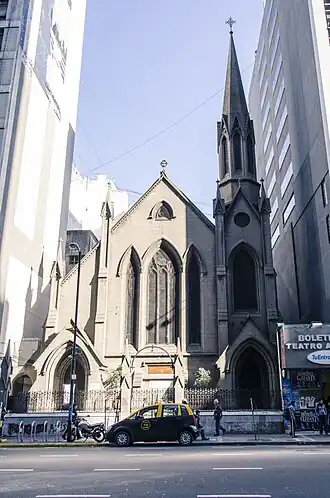 El primer templo se encontraba en la calle Cangallo (actualmente Tte. Gral. Juan Domingo Perón), entre 25 de Mayo y Reconquista, en el barrio de San Nicolás.[5] El nuevo templo, de estilo neogótico, es obra del arquitecto Enrique Hunt,[6] y fue inaugurado en 1874, en su actual emplazamiento en la Avenida Corrientes 718.[7] Sus vitrales tienen corderos y cruces; en su interior cuenta con un órgano de la firma británica Forster and Andrews de 1882, único en Buenos Aires.[8]