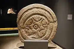 Presenta en el anverso un anillo rodeado de seis segmentos curvos en representación de los cuartos lunares, entre dos círculos concéntricos que hacen de marco, y en el reverso un anillo del que parten en esvástica cinco brazos curvos, resaltándose en relieve el marco.
