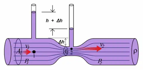 Las partículas fluidas están sujetas únicamente a la presión y su propio peso. Si un fluido atómico fluye horizontalmente y a lo largo de una sección de una línea de corriente, donde la velocidad aumenta, solo puede ser porque el fluido en esa sección se ha movido desde una región de mayor presión a una región de menor presión; y si su velocidad disminuye, solo puede ser porque se ha movido de una región de presión más baja a una región de presión más alta. En consecuencia, dentro de un fluido que fluye horizontalmente, la velocidad más alta ocurre donde la presión es más baja, y la velocidad más baja ocurre donde la presión es más alta.[10]