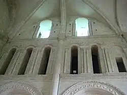 El presbiterio tiene 14 m de longitud y 9 m de anchura. Su altura es de 14 m. En su interior presenta tres niveles de arquerías semicirculares típicas del estilo románico de Normandía. Las del segundo nivel forman parte de una galería y las del tercer nivel son ventanas. En las paredes se conservan trazas de la decoración pictórica que las cubría, líneas o estrellas.