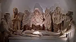 - Entierro de Cristo. Se trata de un conjunto de figuras esculpidas en piedra, de tamaño natural y que representan la escena del entierro de Cristo. El grupo está centrado por un Cristo yacente sobre una tela sostenida en los extremos por Nicodemo y José de Arimatea, que se encuentran de perfil. Al fondo, detrás del cuerpo de Cristo y de cara están los cinco personajes restantes: las Tres Marías con Juan Evangelista y la Virgen María; de izquierda a derecha: María Salomé, San Juan, la Virgen madre de Cristo, María (madre de santo Santiago el Menor) y María Magdalena. Esta valiosa pieza es del siglo XV y antes estaba situada en el interior de la iglesia.