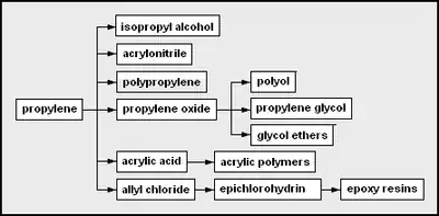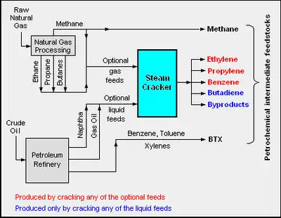 El diagrama adyacente muestra esquemáticamente las principales fuentes de hidrocarburos utilizadas en la producción de productos petroquímicos.[1][2][5][6]