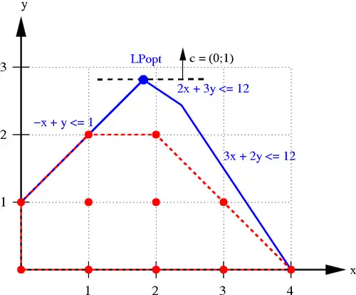 Los puntos enteros factibles se muestran en rojo, y las líneas rojas discontinuas delimitan la región convexa, la cual es el poliedro más pequeño que contiene todos esos puntos. Las líneas de azul, junto con el eje de coordenadas definen el poliedro de la relajación del PL, el cual está dado por las desigualdades sin la restricción de entera. La meta de la optimización es mover la línea de puntos negros tan arriba como se pueda mientras que ésta siga tocando el poliedro. Las soluciones óptimas del problema entero son los puntos y los cuales dan un valor de la función objetivo de 2. El óptimo único de la relajación es con un valor de la función objetivo de 2.8. Note que si la solución de la relajación es redondeada al entero más cercano, ésta no es factible para el PLE.