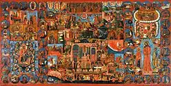 Solían ser iconos de gran tamaño pintados sobre lienzo y vendidos como recuerdo a los peregrinos cristianos ortodoxos a Tierra Santa.[2] Representaban una visión topográfica de los lugares santos cristianos, con la ciudad amurallada de Jerusalén y la iglesia del Santo Sepulcro situadas en el centro.[2] Representaban el género visualmente más atractivo de la floreciente industria local de iconos de finales del período otomano. Los artistas palestinos del siglo XIX dominaban la producción de recuerdos para peregrinos también en Egipto y Siria. Posiblemente creados por primera vez en la segunda mitad del siglo XVII, el ejemplar más antiguo que se conserva entre los varios centenares que han sobrevivido es de 1704. En la primera mitad del siglo XIX, el modelo cambió, sustituyendo la representación topográfica por un mosaico de iconos, todavía centrados en la iglesia del Santo Sepulcro y en la ceremonia del Fuego Sagrado, pero rodeados de escenas de la vida de Cristo y del Himno Acatisto de la Theotokos.[2]