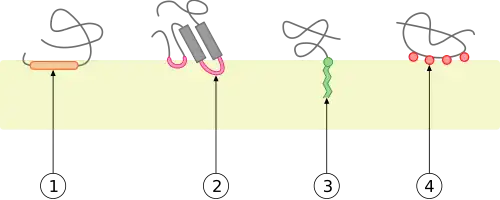 Las proteínas integrales y periféricas se pueden modificar postraduccionalmente, con adición de ácido graso, diacilglicerol[6] o cadenas de prenilo, o GPI (glicosilfosfatidilinositol), que puede estar anclado en la bicapa lipídica.