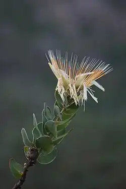 Las inflorescencias son solitarias y se asemejan a un volante cuando está abierto. El fruto es una nuez densamente peluda. Se reconocen dos subespecies:. subsp aurea y subsp potbergensis con la última rara y restringida a Potberg.